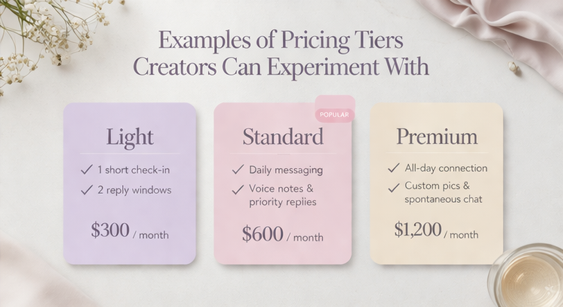 Some creators also include voice notes, check-ins, priority replies, or a themed “good morning / good night” rhythm. The core value is not more posts. It is more emotional presence.