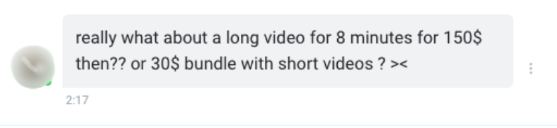 Once the fan is engaged, top creators listen to their needs and offer tailored bundles or custom videos. As seen in the example, a simple chat can turn into a $150 custom video or a $30 bundle negotiation.