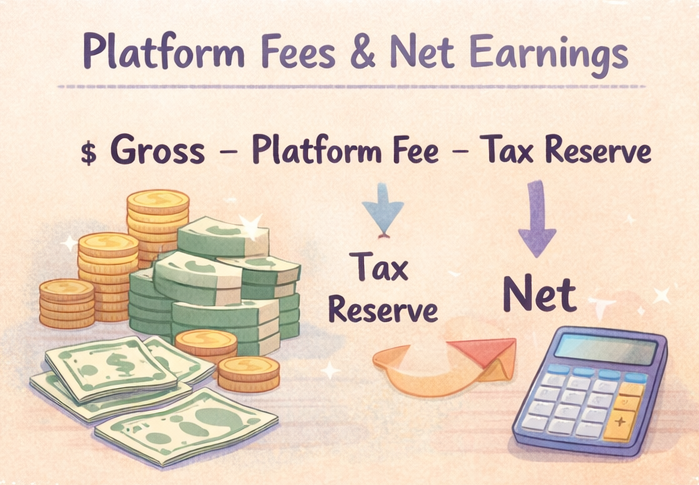 Net estimate = Gross × (1 − platform fee) − tax reserve − business costs