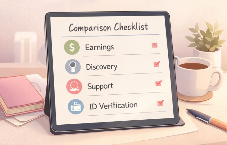 Look at ID checks, age requirements, AI content rules, and what happens if content includes other people. You want a platform that fits your style without making compliance confusing later.